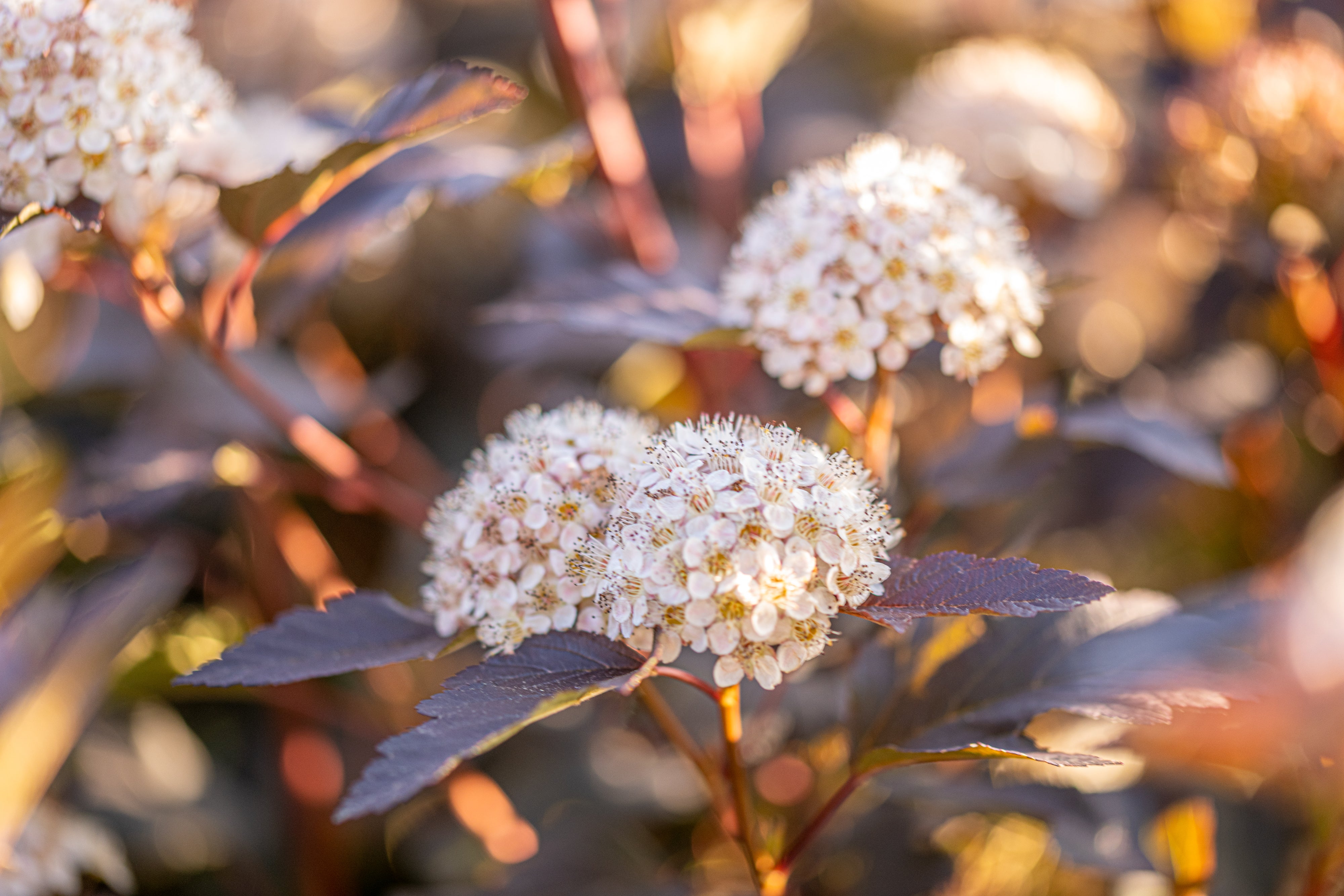 De Physocarpus opulifolius 'Diabolo' is een opvallende sierheester die uitblinkt door zijn dieppurperen bladkleur, witte tot lichtroze bloemschermen en aantrekkelijke groeivorm. Deze sterke bladverliezende struik heeft een bossige, opgaande habitus en zorgt het hele groeiseizoen voor kleur en contrast in de tuin. In juni bloeit 'Diabolo' met kleine bloemen in ronde schermen die mooi afsteken tegen het donkere blad. In de herfst volgen decoratieve zaadhoofden en een warme verkleuring. Ook de schors van oudere takken schilfert licht af, wat extra structuur geeft in de winter.