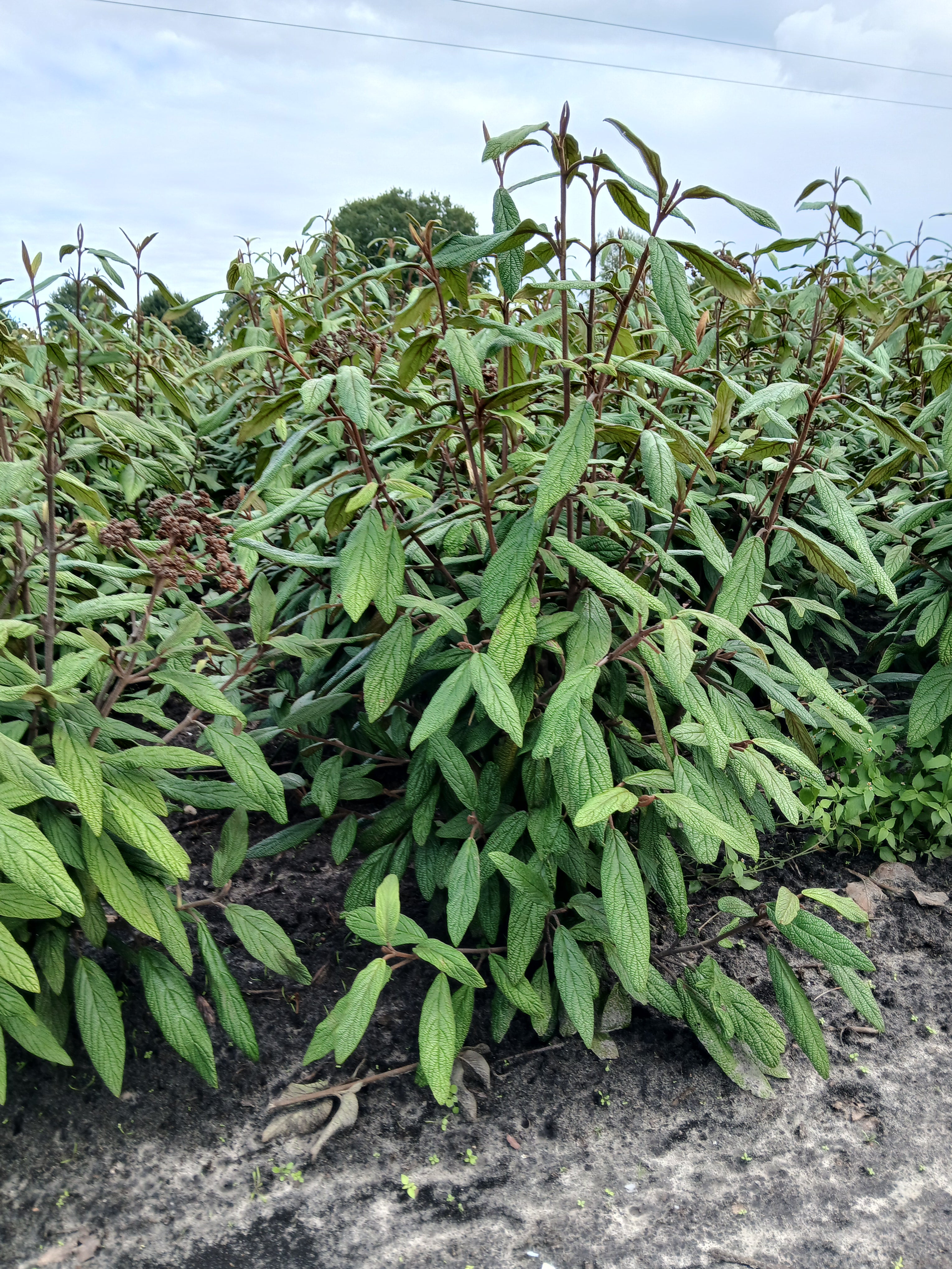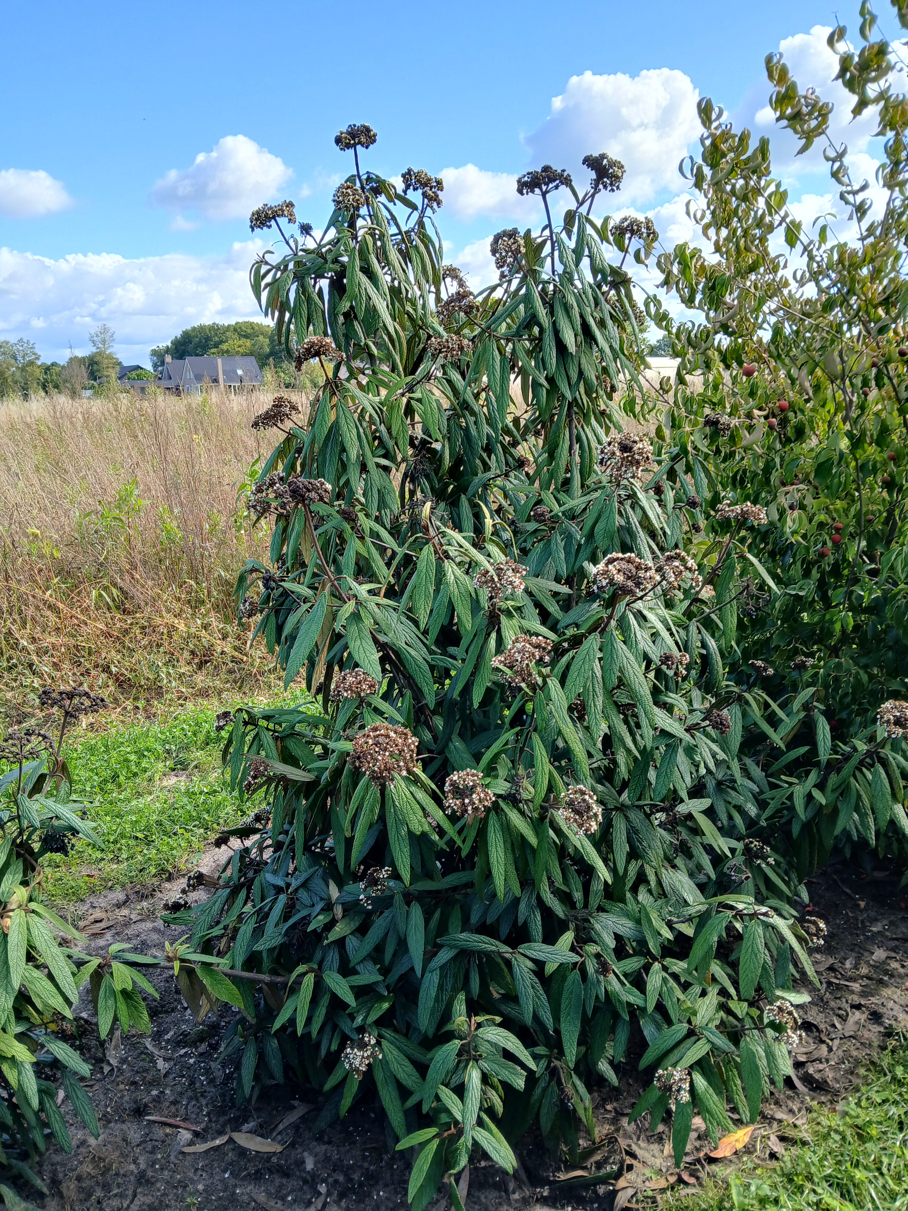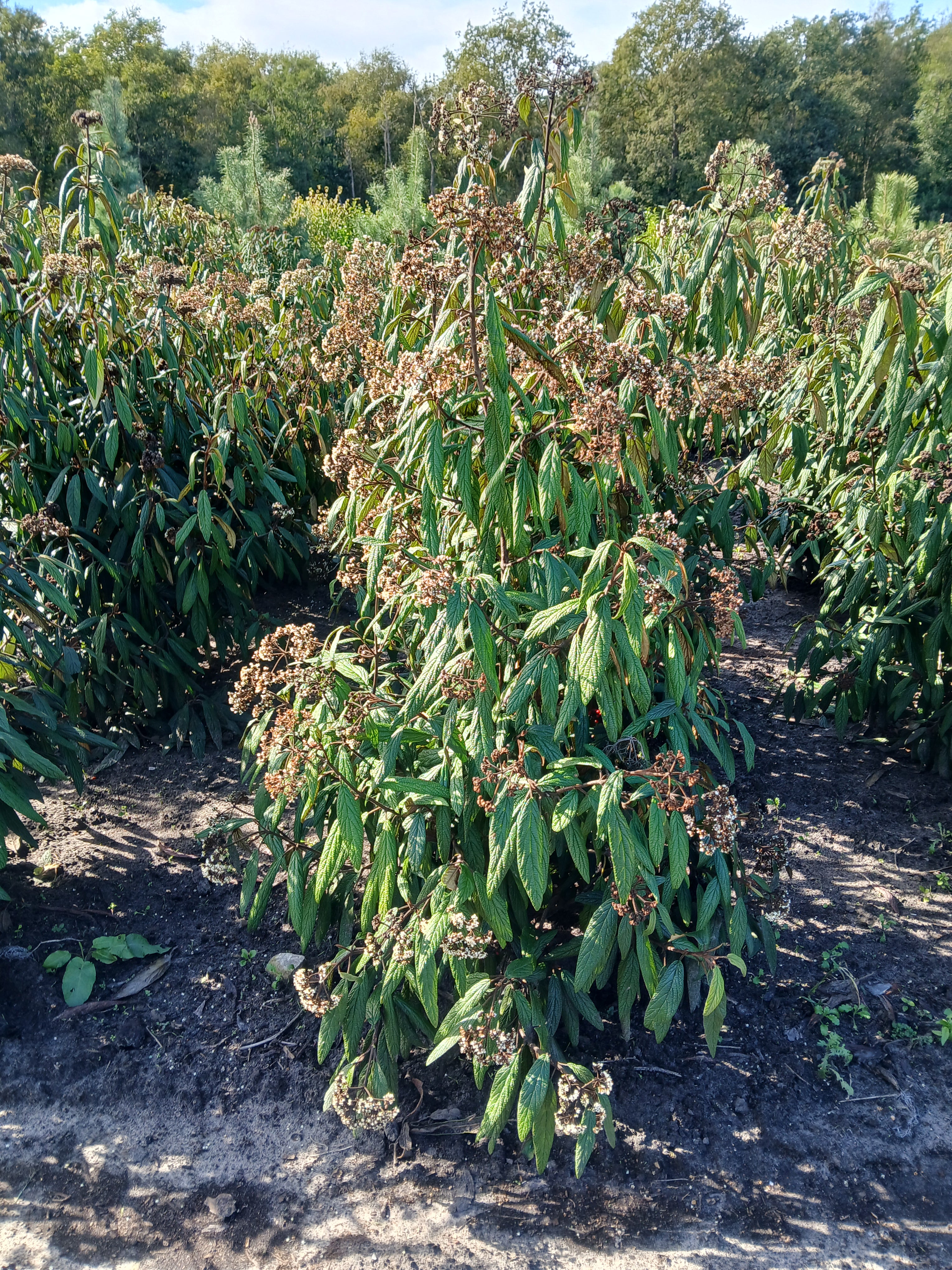 De Viburnum rhytidophyllum is een krachtige, wintergroene sierheester die opvalt door zijn grote, leerachtige bladeren met een kenmerkend rimpelig oppervlak. Het blad is donkergroen aan de bovenzijde en grijsviltig aan de onderkant, wat voor een prachtig contrast zorgt. Deze Viburnum bloeit in mei en juni met lichtgele tot crème-witte bloemschermen die bijen en insecten aantrekken. In de nazomer volgen blauwzwarte bessen, die geliefd zijn bij vogels. Dankzij zijn snelle groei, grote bladvolume en wintergroen karakter is dit een uitstekende keuze voor tuinen waar jaarrond structuur en privacy gewenst zijn.